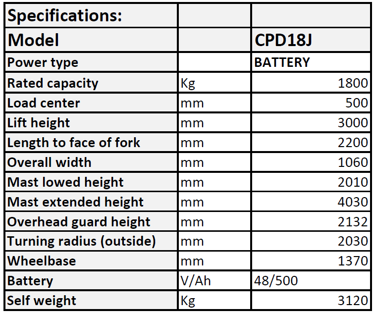 Electric ForkliftCPD18J Electric 1.8 ton forklifts, 3 stage with 4.5m mast and full free, 1220mm fork size with special tyres that will not damage factory floors.